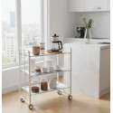 O carrinho pode ser utilizado em três posições – aberto, semiaberto e fechado. As três prateleiras espaçosas asseguram estabilidade e praticidade, ideais para o dia a dia. As superfícies em laminado são resistentes à água e à abrasão, fáceis de limpar e duradouras.